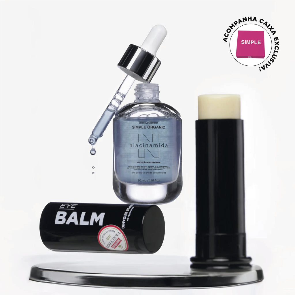 Onde usar: Solução Niacinamida no Rosto e o Balm de Olhos na região sensível ao redor dos olhos.