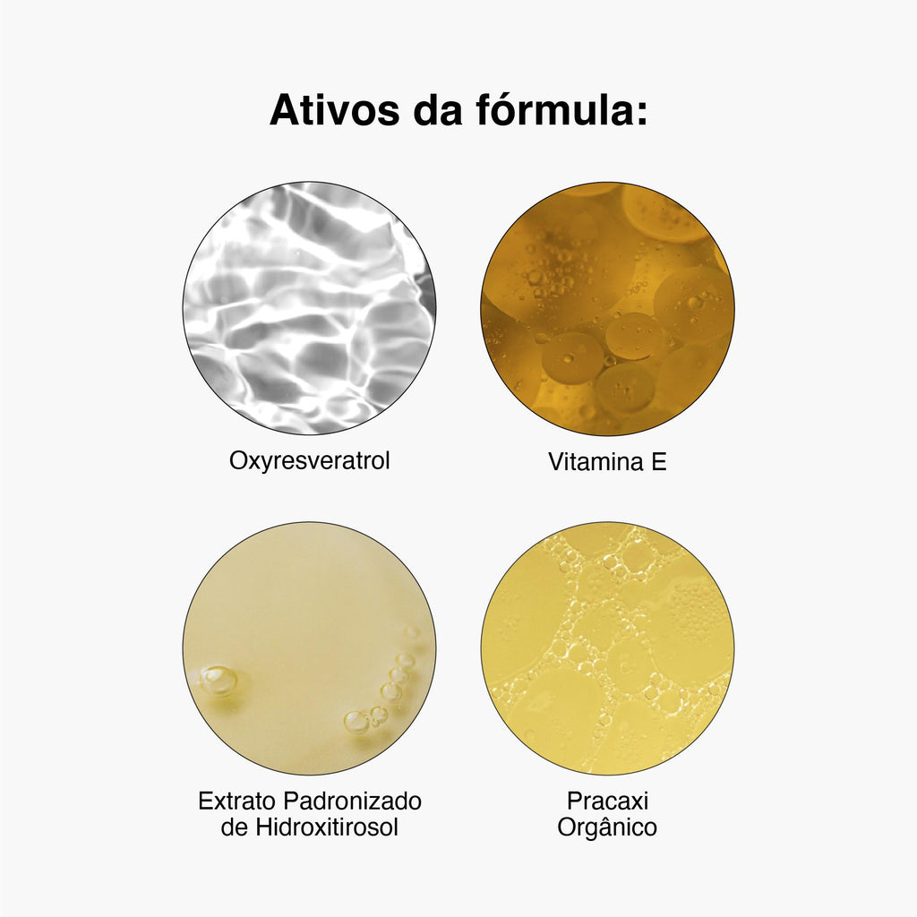 ATIVOS: Oxyresveratrol, Extrato Padronizado de Hidroxitirosol, Pracaxi Orgânico e Vitamina E.